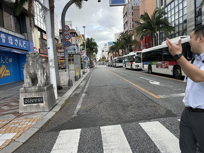 修学旅行最終日!班別研修の様子です。それぞれの班が、悪戦苦闘しながら訪問先への移動、食事などを行っているようです。国際通りのシーサーや国際通りの様子も写真が届きましたので載せました。
