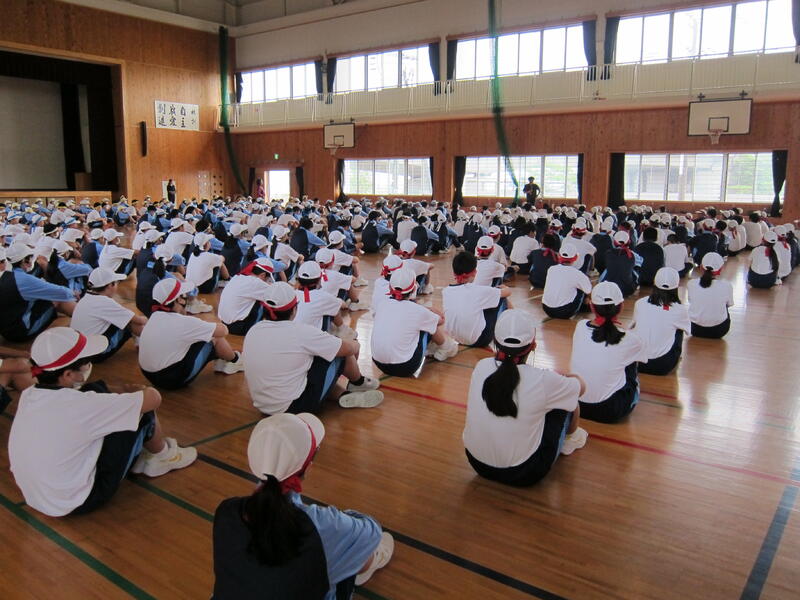 まず、交通安全モデル校指定交付式があり、延岡警察署交通課より指定書を受け取りました。代表は、全校生活委員長の髙木翔馬さんです。