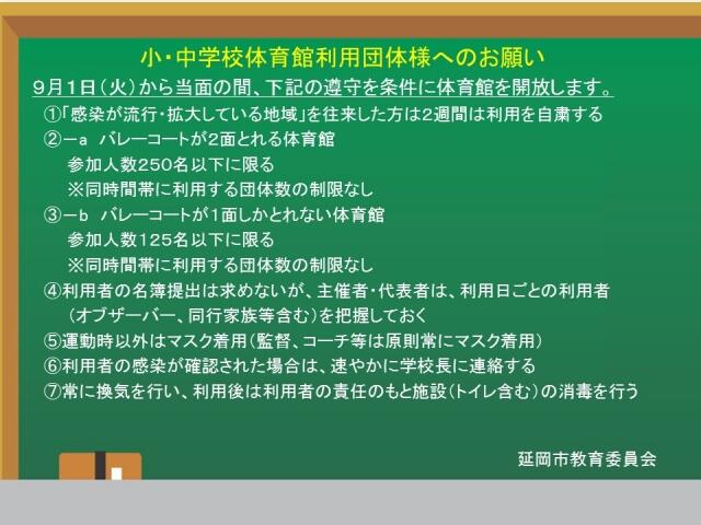 ⑦の消毒については延岡市の方針通り、各団体で施設消毒用の消毒液やスプレー等を準備していただき、消毒してもらうようにしたいと考えています。