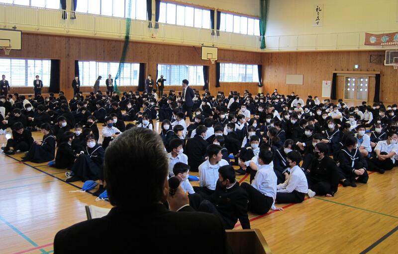 全校生徒が体育館に入る3年ぶりの行事でした。全校生徒が一つの場所に集まると一体感がでますね。皆さん、真剣に聞いていました。