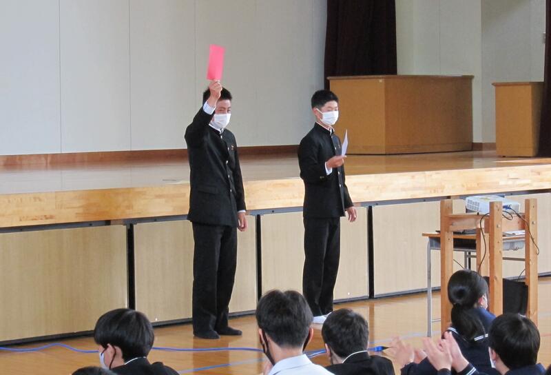 9月21日(木)に1年生12名、2年生10名が立候補し、実施されました。図書室からの中継で、それぞれの想いを演説し、投票は実際の投票箱をお借りして使用しました。3年生の選挙管理委員の皆さんのお陰でスムーズに進めることができました。
