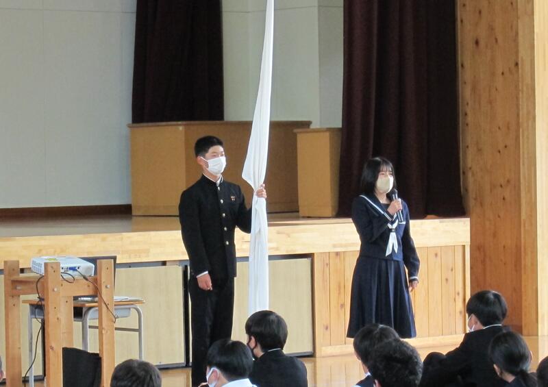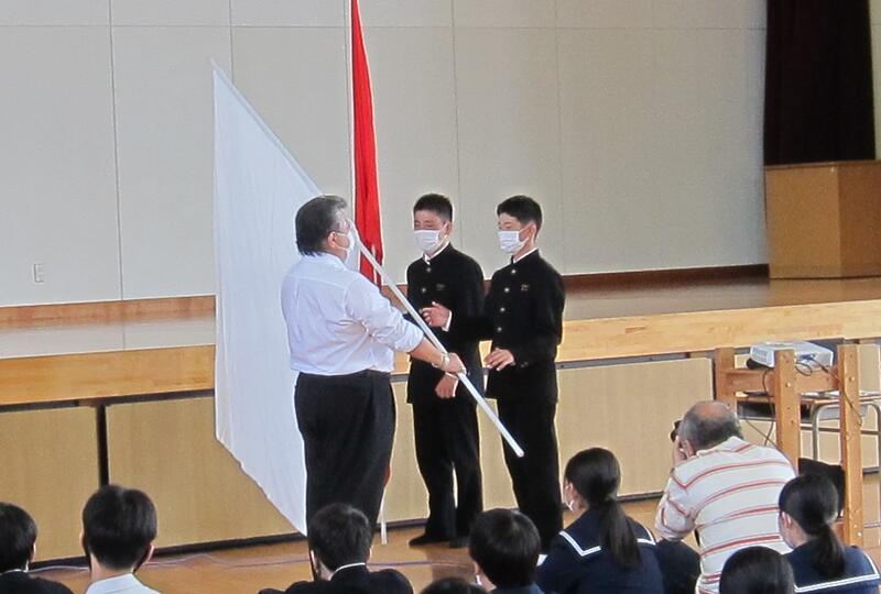 20日(木)に体育大会に向けての結団式がありました。団色の決定と団旗授与、団長・副団長の決意表明です。体育大会は5月14日(日)実施、雨天時は16日(火)に延期です。
