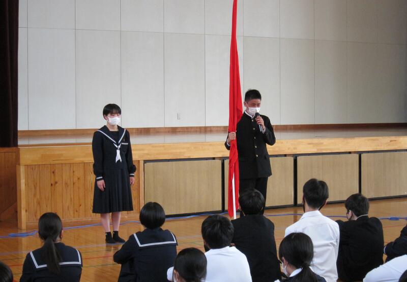 20日(木)に体育大会に向けての結団式がありました。団色の決定と団旗授与、団長・副団長の決意表明です。体育大会は5月14日(日)実施、雨天時は16日(火)に延期です。