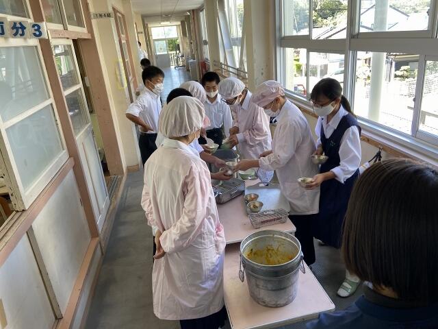 10月10日の「目の愛護デー」に因んで、今日の給食は、ビタミンAが多く含まれているカボチャを使った煮物とサラダ、アントシアニンが多く含まれているブルーベリーでした。