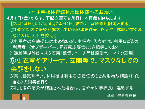延岡市教育委員会から連絡があり、夜間の社会教育団体等への学校体育館等の貸し出しを再開することとなりました。