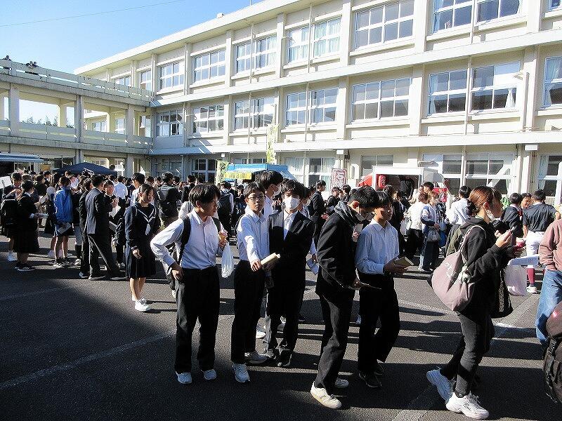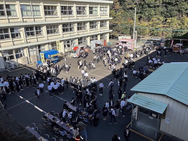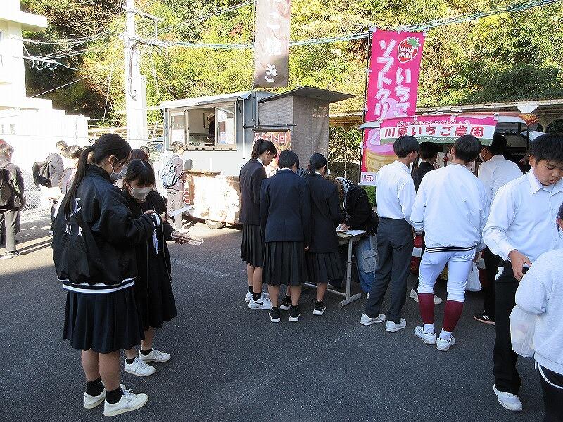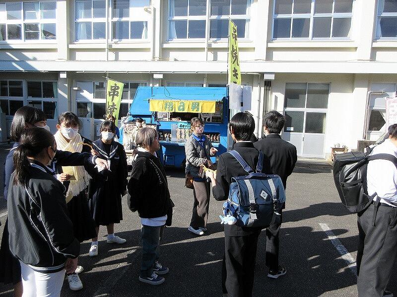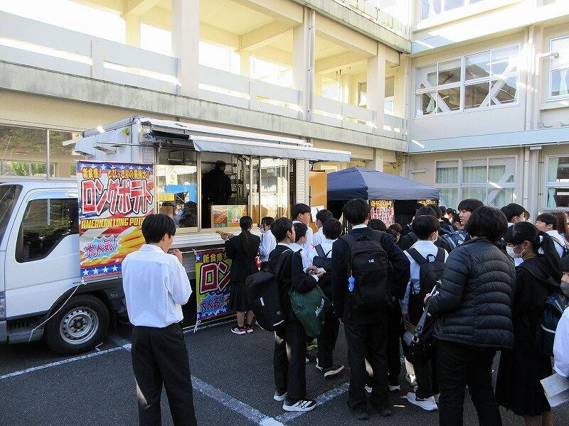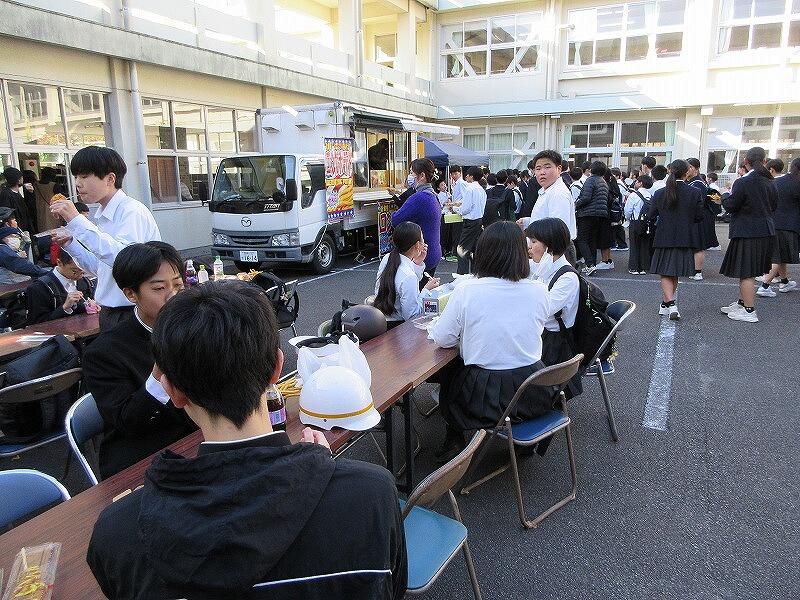 12月12日(金)に、第3回参観日・PTAバザーを開催しました。今回は、キッチンカーをメインに実施しました。初めての試みでしたが、「初めてのキッチンカーでの買い物をしました。」、「こんな行列の中買って食べるのは初めてです。」 という生徒もいました。写真でも掲載していますが、PTA高田総務部長の「生徒に楽しんでもらえるバザー」という目標に届いたのではないかと思います。また、PTA会長の來住会長をはじめ多くのPTA役員や保護者の方の協力ありがとうございました。