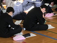 校長先生から「激励のことば」、学年主任から「入試に向けた心構え」、進学主任から「当日の流れ」を説明した後、生徒の皆さんは、受験校別に分かれて具体的な当日の流れを確認しました。