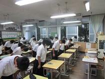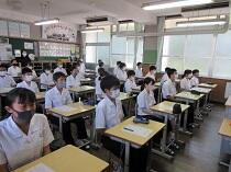 放送による終業式で、表彰、学年・生徒会代表の話 学校長の話をメモをとりながら聞くスタイルで実施し、各学年とも真剣に話を聞いていました。1学期は、新型コロナの関係で制限も多かったですが、頑張ってくれたことを嬉しく思います。