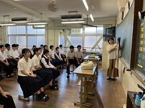 6月25日(火)に、平和学習を実施しました。今回は宮崎県遺族連合会に依頼して、講師をお招きしての講話でした。特に延岡大空襲の状況や、赤水地区にあった水上特攻隊の格納庫の話など、地域に起こった戦争に関する話に対して、生徒は真剣に聞く様子がうかがえました。また、今回は会場を各学年ごとに分け、3年生の講話会場をそれぞれの会場に配信するシステムを試行してみました。今後、世界平和のために自分にできる事を考えるきっかけになることを期待しています。