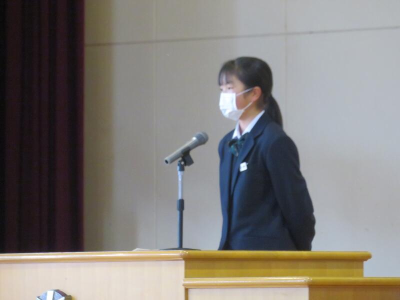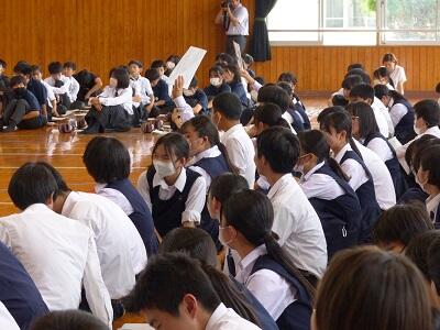 お話の内容は、2人が1年生のときから今回の受験までの取組や心構えについてです。「まだ進路が定まらない1年生の頃に、お母さんに『どこの高校にもいけるように、夢が決まったとき迷うことがないように勉強しておきなさい。』と助言され、後悔のないように勉強を続けてきたこと。」「日頃から勉強する雰囲気をつくるためにも毎日のみんなの授業態度が大切。」「まだ先の話じゃない。時間は待ってくれない、今を大切に使うべき。」など後輩たちにとても役に立つお話をしてくれました。3年生は受験真っ最中。もうひとふんばり頑張りましょう。1・2年生は先輩のお話の通り、将来を見据え、今を大切に頑張りましょう。