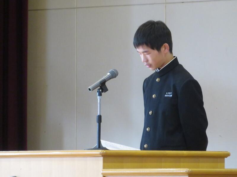 本日は修了の日でした。代表の生徒が1年間を振り返り次年度に向けてに発表しました。「部活動で自己ベストを出せるよう日々努力した。苦手教科を克服したい。家庭学習の時間を増やす。学年では、自信をもって返事やあいさつをしたい。」「提出物の期限を守りたい。移動の時静かに移動する。時間を守り自ら行動する。集団での行動がとてもよくなった。絆が深まった。」「礼儀面で成長した。募金等のボランティアでみんなの気持ちが伝わりやりがいを感じた。次年度も生徒会活動を頑張る。」本年も大変よく頑張りました。「終わりは始まり。」4月からもみんなで頑張りましょう。