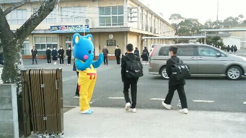とっちゅうにハイタッチ。登校してきた生徒はを笑顔?で出迎えます。