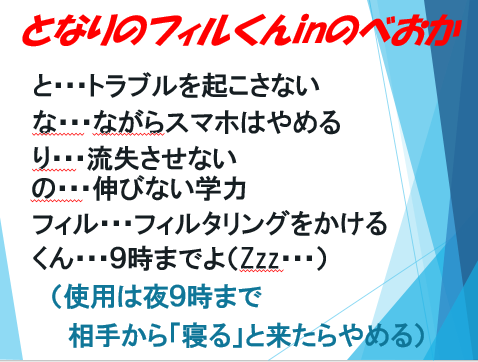 「となりのフィルくん」は延岡市内中学校の取組だそうです。これを機に、スマートフォンやタブレットとのつきあい方を考えていきたいですね。