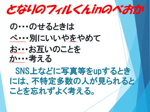 携帯電話等の利用については、メリットもたくさんあるものの、学力低下や健康被害、トラブル等も心配されています。そこで、合い言葉とキャラクターを使い、正しい使い方について呼びかけを行うことになりました。