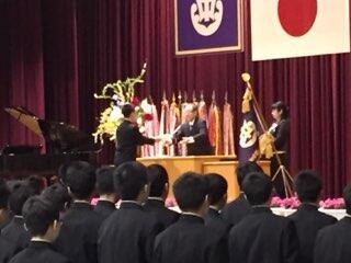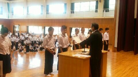 修了証授与では、1年生代表で甲斐慶大くん、2年生代表で尾﨑歩くんが校長先生から修了証を受け取りました。