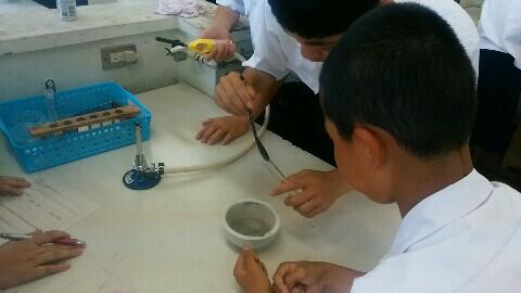 バーナーで加熱をしていく実験なので、実験の手順や安全上の注意を細かく指示します。実験をするときの役割分担についても確認をし、全員が実験に関わります。