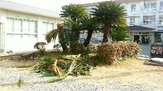 今日の天気は晴れ予報だったのですが、途中、曇ったり雨も降ったり、おまけに風も強く寒い一日でした。そんな中、技術員の堀田先生がソテツの剪定をされました。かなり成長していたようで、剪定後には大量の枝葉が切り取られていました。