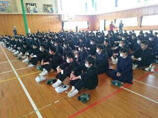 今日の6校時は、県立高校一般入試を受検する生徒を体育館に集めて、心構えや受験場での過ごし方など細かな部分の確認をしました。もちろん受検生は真剣に聴いており、緊張感が伝わってきました。頑張れ土々呂中受検生。