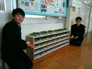さて、そのような状況の中、武田先生(技術科)の指導の下、3年生の甲斐君と藤島君がスリッパ入れを制作してくれました。調理室前の廊下に設置してあります。お寄りの際はぜひご覧ください。
