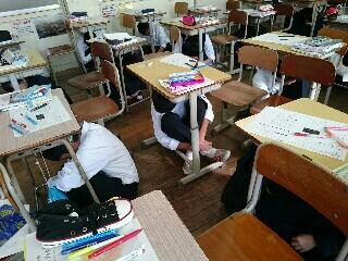 「まず低く」「頭を守り」「動かない」の身を守る行動を1分間実施しました。緊急地震速報、放送と同時に机の下に隠れ、静かな状態で身の安全を守りました。緊急地震速報の音にびっくりしましたが、落ち着いて行動ができていました。騒いだりふざけたりする生徒もいませんでした。さすがトッチュウ生。