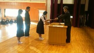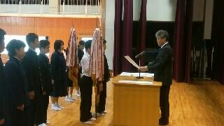先日の生徒会役員改選を受けて、生徒会役員認証式がありました。旧役員には校長先生より感謝状が渡されました。