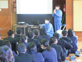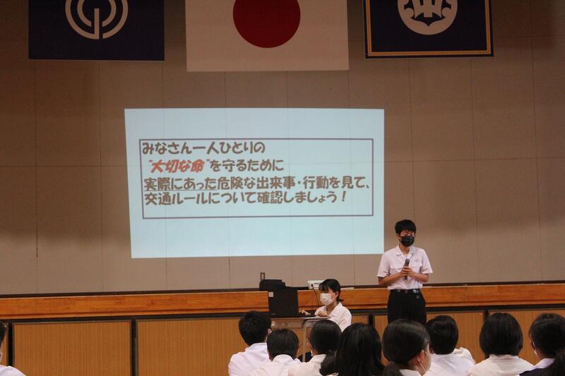本日昼休みに、自転車通学生集会が行われました。生活委員会(委員長・副委員長)が自転車通学生に、安全な運転を心がけ、自分の命を守るように呼びかけました。また、自転車の施錠することも忘れないように呼びかけました。命を大切にすることが一番です。自転車事故がないように気を付けましょう。