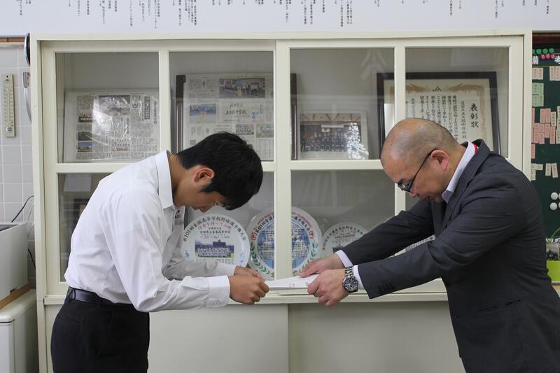 本年度、警察署から「自転車盗難防止モデル校」に指定され、5月10日(火)、警察署の方から本校生徒会生活委員長に指定書が授与されました。これから本校生徒会が中心となり、本校の自転車盗難防止に取り組みます。
