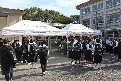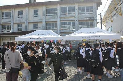 本日は、日曜フリー参観・PTAバザーが行われました。各学年、執行部でお弁当、ジュース、豚足、ドーナツ、うどん、ちゃんぽん、饅頭など予約販売を行いました。コロナ禍にあるので、食品は学校で食せず、持ち帰るようにしました。また、ドライフラワー、パン、フライドポテト、ジビエ、くじなどの当日販売も行いました。PTA活動として、長い時間をかけて準備をしていただいた役員、委員の皆様お疲れ様でした。お買い上げいただいた皆様、そして物品販売にご協力いただいた業者様に心から感謝申し上げます。さらには、テント、長机などを準備・片づけてくれた生徒の皆さんにもお礼を言います。ありがとうございました。子供たちの笑顔も見られて、保護者の皆様の笑い声も聞けて、とても楽しいバザーとなりました。学校に元気をいただきました。ありがとうございました。