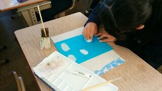 筆以外にもスポンジやティッシュを使って雲を描きました。子どもたちは、水の量を調節したり、筆やスポンジ、ティッシュの組み合わせでいろいろな雲を表現していました。