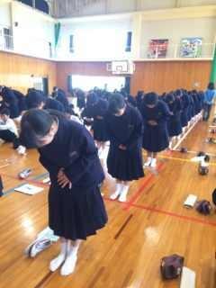 日章学園高校から先生と6名の生徒が来て指導してくれました。発声練習や立ち方、お辞儀の仕方や気持ちの良い挨拶のポイントなど、実践を通して学習することができました。職場体験はもちろんですが、普段の生活でも正しい礼儀を心がけていきたいですね。