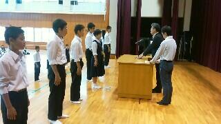 先日の生徒会役員改選を受けて、生徒会役員認証式がありました。旧役員には校長先生より感謝状が渡されました。