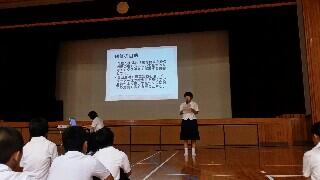 本日、生徒集会があり、生徒会が主体的に会を進めました。写真は、夏休みに行った「リーダー研修会」の報告のひとコマです。全校生徒、真剣に話を聞いていました。