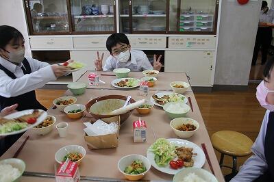 本日の3・4校時は1年1組7組の家庭科の調理実習でした。はげまし隊の皆様も支援していただいて、生姜焼き、サラダなどを作りました。アドバイスをいただきながら、調理を楽しんでいました。おいしい生姜焼きが完成しました。