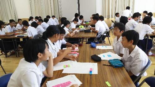 研修では、「土々呂中学校をより良くしていくために」というテーマでの話し合い活動や、高校で生徒会長として頑張っている卒業生に話を聞く活動がありました。