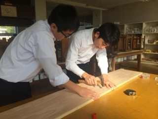 調理室で使う靴箱を3年生生徒2名が作製中です。