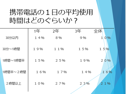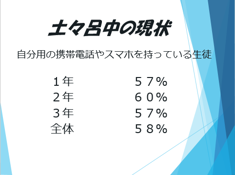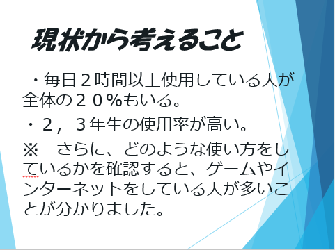 生徒会が携帯電話やスマートフォン、タブレットなどの使用についての取組をしています。先週の生徒集会で説明する予定でしたが、インフルエンザの影響で生徒集会が中止になりました。そのため、取組について給食時の放送で説明しました。