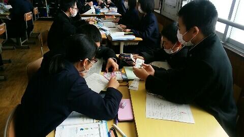 グループに分かれて、買い物を想定した英文を作り会話の練習をします。