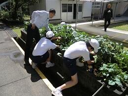 7組では、昨年度3月にじゃがいもの種芋を植え、今か今かと見守ってきました。いや…生徒よりも先生たちの方が気にしていたような…。