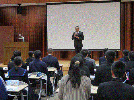 講師に、延岡警察署 交通課企画安全係長 森山達徳様においでいただき、交通安全について、ユーモアたっぷりに楽しく講話していただきました。