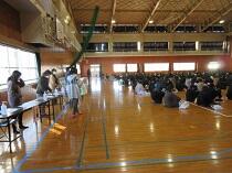 12月3日 生徒集会を実施しました。各専門委員会の取組反省と目標の確認、学力クラスマッチの表彰、保体委員会から換気・消毒のお願い、ペットボトルキャップ回収の協力へのお礼などがありました。