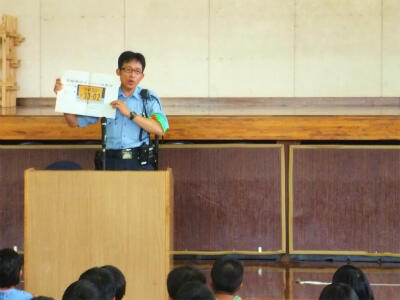 田中 佑樹先生の紹介や、上南方駐在所の新原所長のお話に、子どもたちは真剣に耳を傾けていました。不審な車や、危険な場面を目撃した時には「ナンバーを覚える」とのことです。新原所長にはこの後、職員向けに、不審者対策の研修も行っていただきました。いつも地域の安全を守って下さりありがとうございます(^^)
