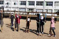2回目の竹馬タイムを行いました。あちらこちらから「さむ~い」と声が聞こえてきました。しかし、竹馬を手にした子どもたちは、それぞれが生き生きと練習を始めました。1年生も竹馬に乗る練習を一生懸命にがんばりました。