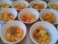 フルーツを使って、クラッカーの上にクリームやフルーツをトッピングをしたり、フルーツポンチを作ったりしました完成したものは先生方にもお配りし、自分たちでも試食をしました