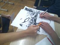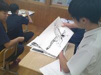 3年生の美術の時間では、水墨画の作品鑑賞を行いました。生徒たちは友だちの作品一つひとつに目を向け、色の濃淡や筆の運び方、空間の使い方などに注目しながら鑑賞しました。形の捉え方や空白の使い方など、作品ごとの特徴を比べながら、「自分もこう描いてみたい」と意欲を膨らませる生徒もいました。今回の鑑賞を通じて、互いの良さを認め合い、感性を広げる貴重な時間となりました