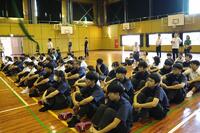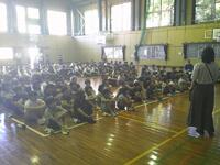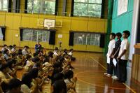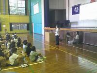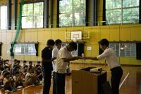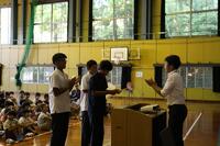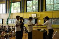 今日は、全校集会がありました。始めに表彰式を行いました。中体連での部活動表彰【テニス男子団体3位、男子テニス個人の部優勝 柴田琉心さん・甲斐蓮人さんペア、】、サイエンススクール優秀賞受賞【橋本明來さん】の表彰式です。代表4人の生徒たちとテニス部の皆さんは、それぞれ立派な活躍をしてくれました。