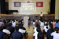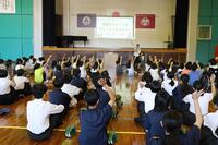 今日は、山本延久教頭先生がお話をしてくださいました。「今日は何の日クイズ」や「これは誰でしょうクイズ」を盛り込み、児童生徒はそのクイズがおもしろくて、笑いがたくさんおこりましたね。最後は、ご出張中の井上校長先生が写真で登場し、みんなに気をつけてほしいことがプレゼンテーションによって紹介されました。ありがとうございました。
