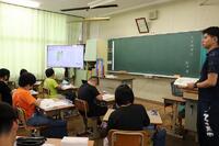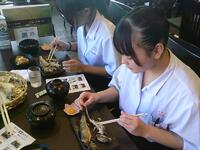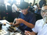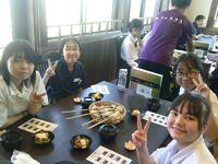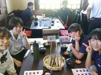 野口遵記念館を見学したあと、かわまち交流館に行き、延岡に昔から伝わる漁のしかたや川の恵みを生かした食文化について学びました。市の水産課の方による講話では、鮎の漁の期間や、漁の方法などについて詳しく教えていただきました。また、「自然を守ることが鮎を守ることにつながる」というお話を聞きました。川をきれいに保つことや、生きものにやさしい行動をとることなど、自分たちにできることを考えるきっかけにもなりました。講話はクイズ形式で進められ、楽しみながら学ぶことができました。その後の鮎の試食会では、鮎を使ったさまざまな料理を味わい、その香ばしさややわらかい食感に思わず笑顔がこぼれました。季節の美味をいただき、ふるさとの恵みを実感。鮎の骨抜きや食べ方の説明もわかりやすく、延岡の食文化に親しむ貴重な体験となりました。自然とともに生きるふるさとの知恵や豊かさを感じた、心に残る一日となりました