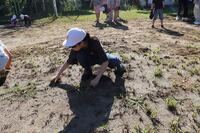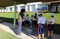 お次は小学2年生。こちらも担任の先生と夏野菜の収穫(まだピーマンとナスが小ぶりですがたくさん実っています)