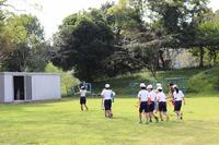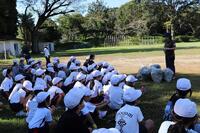 晴天の中、小学3、4年生は、バスの運転手さんに「今日はよろしくお願いいたします」の元気なあいさつを済ませ、内藤記念博物館やしろやまの鐘つきのある頂上まで登ってきました。