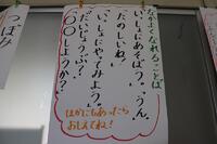 小学4年生です。「まえむ木」を育てている真最中です真最中です。ほかにも「うめらいす」「あいうえお」にちなんだ話の聞き方やその時使う素敵な言葉の掲示物がありました。